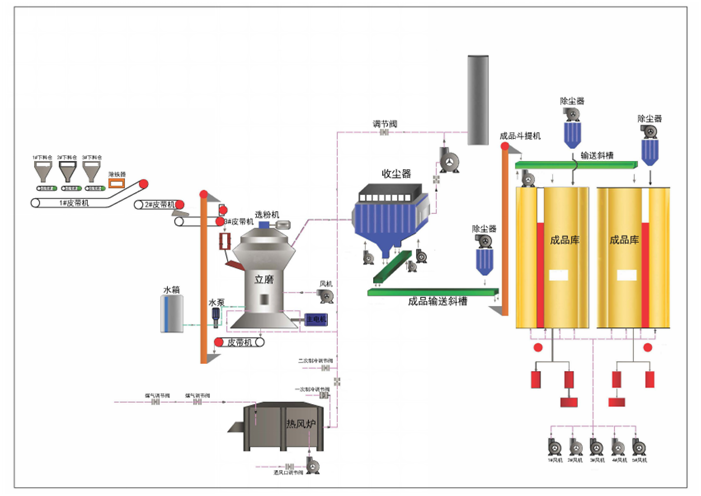 堆放著(zhe)的礦渣由鏟車取料、喂料,通(tōng)過皮帶(dài)機進行輸送(sòng)。在輸送(sòng)過程中,礦渣原料先後經由除鐵器和振動篩得到除鐵和篩分(fèn),然(rán)後通過稱重設備倉、提升機進入(rù)礦渣立磨機進行(háng)粉磨。粉磨(mó)後的礦渣借助熱風爐提供的熱風,通過選粉機進行選粉,同時得(dé)到烘幹。符合細度要(yào)求的礦渣粉較後被輸送到收(shōu)塵器收集、盛放後,由空氣輸送斜槽、提升機進入成品庫中儲存。